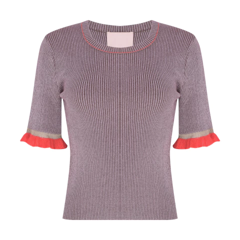 Blusa Lolitta na cor malva, confeccionada em algodão. Modelo de manga média com gola redonda. Possui detalhe de friso na cor coral na gola e listras em dourado e coral nos punhos. Punhos com acabamento em babados. Peça em ótimo estado de conservação. Medidas: Comprimento 52 cm , Busto 60 cm, Costas 30 cm, Cintura 50 cm. Valor: R$440. SKU: eodb-1046-1. Tamanho: G.